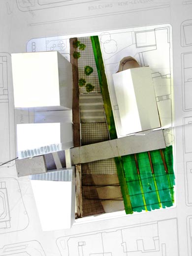 Le site permettait par ces multiples dénivelés, un jeu intéressant entre le niveau du métro vers de la rue de la Gauchetière et le niveau rez-de-chaussée vers le boulevard René-Lévesque. Le lien se fait par un grand escalier urbain qui débute la promenade à la salle d’expo, sous le parvis. Elle est ensuite poursuivit à travers le bâtiment par une série de plateaux suivant la côte de la rue Beaver Hall et alignées avec cette topographie artificielle que nous avons créés. Viennent ensuite, les étages de bureaux et finalement les logements.