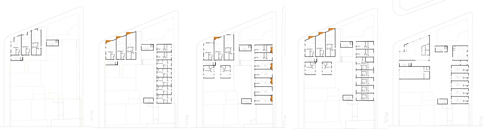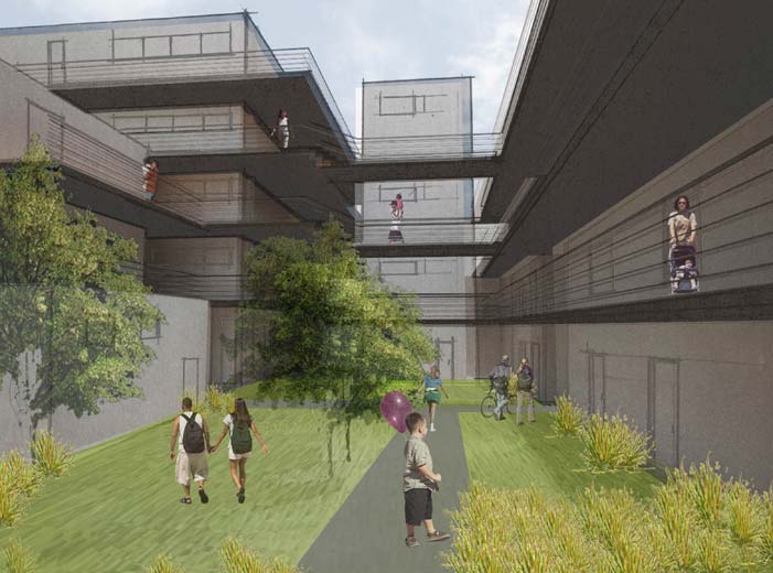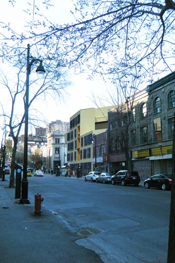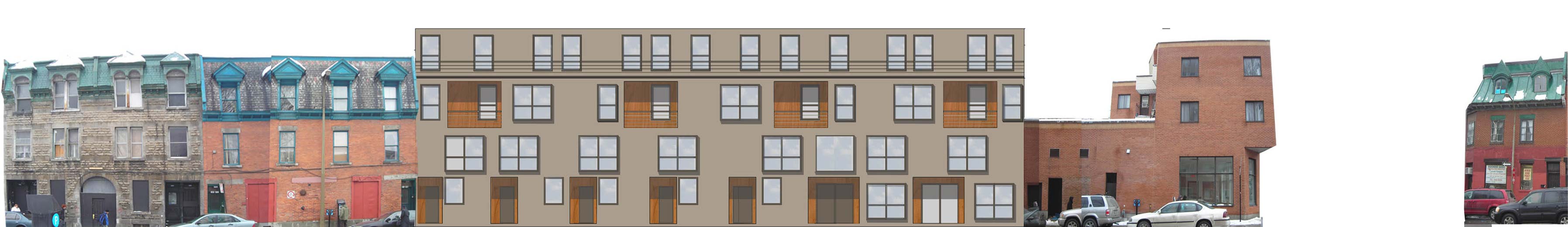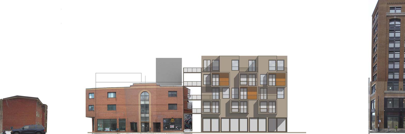 St-Laurent, patrimoine montréalais, témoin d’une vie effervescente et symbole identitaire, imprègne désormais nos mémoires de l’imaginaire d’antan. Sa revitalisation nécessite une adaptation au mode de vie urbain actuel, tout en soulignant ses traits uniques qui en ont fait un boulevard légendaire. Par le passé, sa diversité, sa particularité à rassembler et charmer des personnes de tous genres et son achalandage continuel et constant contribuaient à l’originalité de la « Main ». La densité dorénavant dans un état critique, la vie commerciale ne peut subsister. L’équilibre entre densité, services de proximité et mixité est primordial pour constituer un quartier viable. L’insertion sur cette rue conserve la rythmique commerciale au rez-de-chaussée et différentes typologies de logements abordables aux étages supérieurs. Elle propose aussi de dégager St-Dominique de son allure de ruelle de service et limiter la ségrégation en dialoguant avec les Habitations Jeanne-Mance et le Loft des Arts. L’intervention propose de rebâtir l’îlot autour d’une cour intérieure commune, d’offrir une variété d’espaces extérieurs et une qualité de vie urbaine accessible. Il s’agit de retrouver un environnement diversifié et dynamique afin de raviver la mémoire de St-Laurent, mais aussi assurer sa pérennité dans un futur divergent.