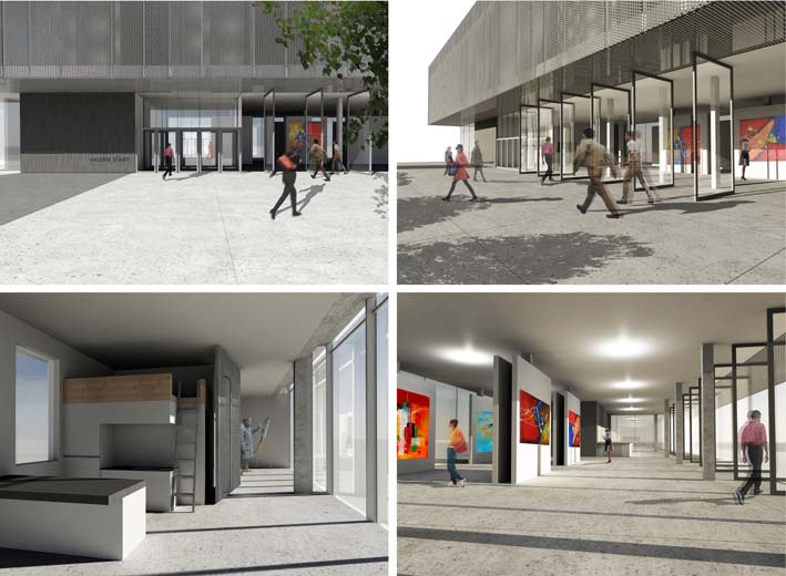 Prenant place sur le boulevard Saint-Laurent, à l’intersection de Maisonneuve, l’intervention s’inscrit dans le mouvement de revitalisation du boulevard Saint-Laurent et dialogue avec le développement du Quartier des spectacles. Si nous ne pouvons nier l’existence d’une ambiguïté certaine entre le désir d’innover et celui de conserver, nous croyons qu’un projet d’intervention sur la «Main» se doit de conjuguer passé, présent et futur. En proposant un plan d’intervention axé sur le spectacle et l’artifice, le Quartier des spectacles évoque sans contredit l’ancien Red Light de Montréal qui demeure, dans la mémoire des gens, un lieu de divertissement et d’évasion. Le défi qui s’impose : réactiver la mémoire du lieu à travers le développement d’un imaginaire patrimonial qui saura évoquer la mémoire de la « Main » d’autrefois. De cette époque mythique, nous retenons surtout la nature bipolaire du boulevard. Le jour, la rue est animée par les commerces en rez-de-chaussée; le soir elle se transforme pour faire place au spectacle, à son caractère ludique et festif. Si le programme du Quartier des spectacles semble répondre aux besoins de l’industrie culturelle à l’échelle internationale, nous souhaitons plutôt le complémenter en adressant l’art et la culture à la collectivité locale. Ateliers d’artistes, galerie d’art, café et cabaret sont réunis sous un même toit afin de constituer un lieu de création, de diffusion, de rencontre et d’échange. L’exploitation de la notion de vitrine suggère l’importance fondamentale de la relation à la rue. Par des jeux de rythme, de superposition et de transparence, la vitrine révèle, invite, tend à participer à l’animation du boulevard de jour comme de nuit.