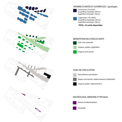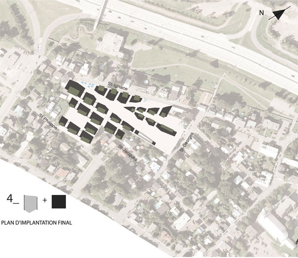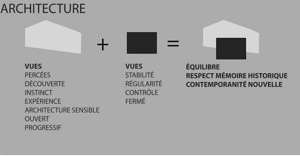 Afin de refléter tout le potentiel et la richesse du site Rose et Laflamme, à La Prairie, mon intervention se concentre sur le travail des percées visuelles et leurs relations entre les points de repères de la ville et le site. En effet, la mise en scène proposée mettra à contribution tant les couches historiques du site lui-même que celles de l’arrondissement historique en entier. Les divers procédés voulant harmoniser ancien au contemporain visent à mettre à profit les caractéristiques locales de l’arrondissement, tant culturelles, sociales qu’architecturales.