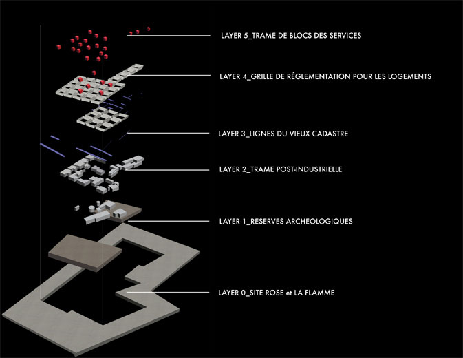 Inspiré par différentes artistes et architectes qui ont traité la question du vide et de la mémoire, le concept repose sur la superposition en cinq étapes de «couches historiques» qui viennent en fait de la superposition à une carte historique. Pour évoquer le vide, au lieu de construire sur le sol, le projet est creusé dans le sol à l’exception des deux zones archéologiques identifiées qui ne sont pas touchées.