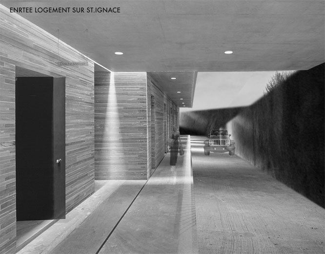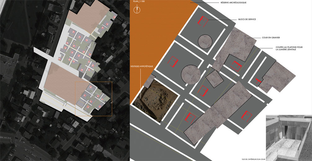 Les anciennes constructions du site deviennent des cours creusées dans le sol autour desquelles s’organisent les habitations. Ces vides deviennent alors des barrières issues d’une force involontaire qui créera une tension entre la personne qui marche dans le parc public
