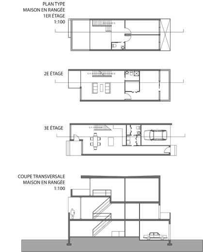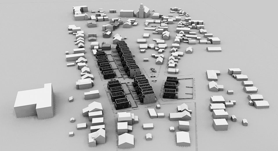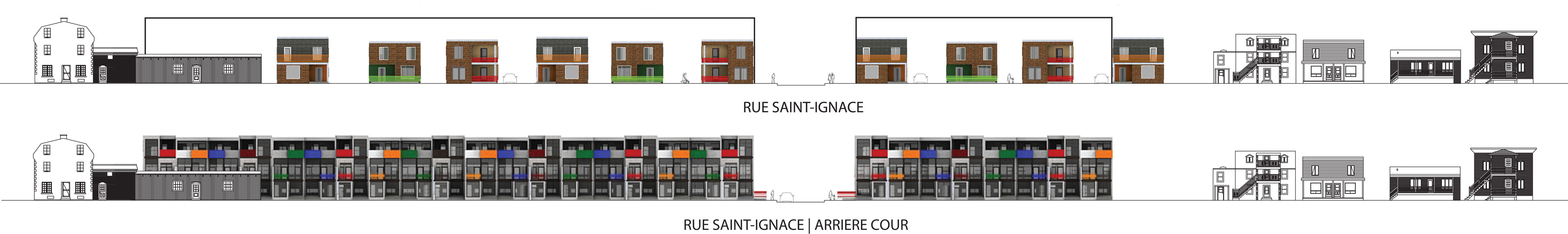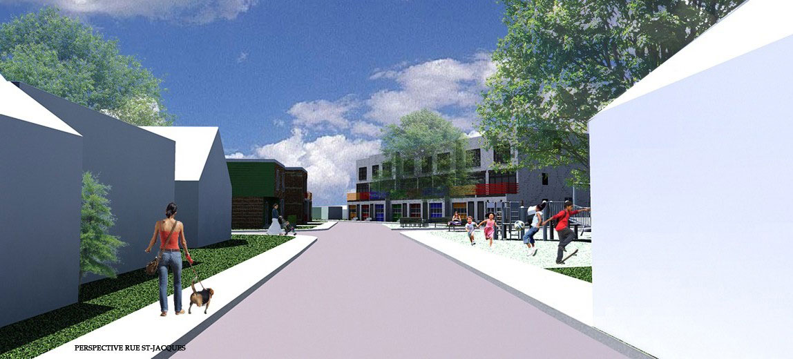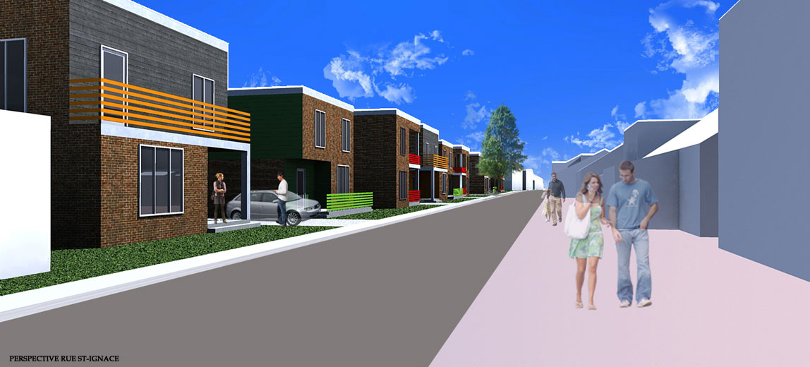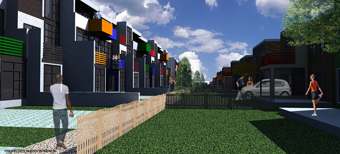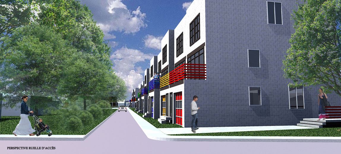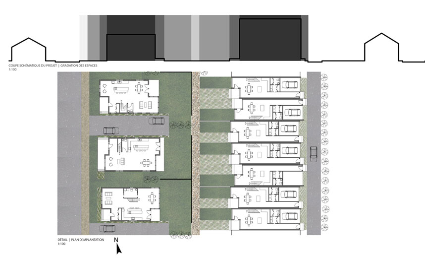 L’arrondissement historique de La Prairie possède une ambiance champêtre qui lui donne un caractère accueillant de petit village « cousu serré » où les gens se connaissent et se voisinent quotidiennement. La proximité qui existe entre les espaces publics et les espaces habités participe à cette atmosphère de partage. Souvent, les maisons sont implantées directement en bordure du trottoir. De même, il est facile d’apercevoir les arrières cours des espaces publics, que se soit du trottoir ou des parcs. Tout en évitant de tomber dans le voyeurisme, il m’est apparu important de travailler sur la notion de cohabitation. Par conséquent, ce projet de développement résidentiel s’insère dans l’arrondissement historique de la ville de La Prairie de façon harmonieuse grâce à l’articulation d’un espace tampon entre la maison et la rue, que je nomme « espace de cohabitation ». L’implantation des habitations jusqu’à l’aménagement intérieur des maisons ont été pensés et conçus dans le but de permettre une gradation des espaces du public vers le privé et vice-versa. Ainsi, chacun peut se sentir, à la fois, chez-soi et dans son quartier.