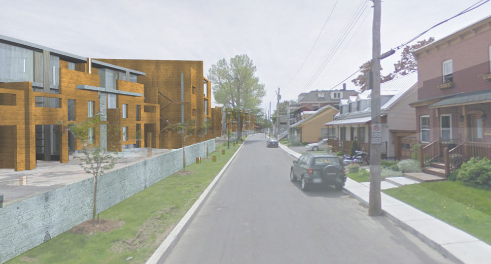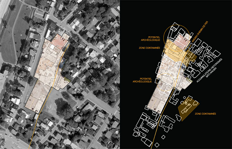 De la genèse du site industriel Rose et Laflamme, véritable trou béant situé en plein cœur de l’arrondissement historique de La Prairie, une synthèse archéologique s’est opérée. Tout part d’un artéfact trouvé sur le site : une immense dalle de béton. Certes, il ne s’agit pas a priori d’un objet de collection extraordinaire, néanmoins, son apparente rusticité révèle une mémoire disparue et, à cet égard, a plus de valeur qu’il n’y paraît. Ses différentes textures peuvent être associés à des vestiges disparus et rappellent la mémoire industrielle du site. Ce faisant, cette dalle devient l’interface archéologique permettant un arrimage à l’histoire du site, un lexique permettant de le décoder.