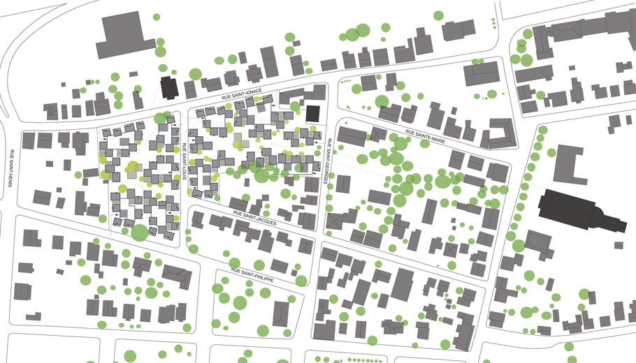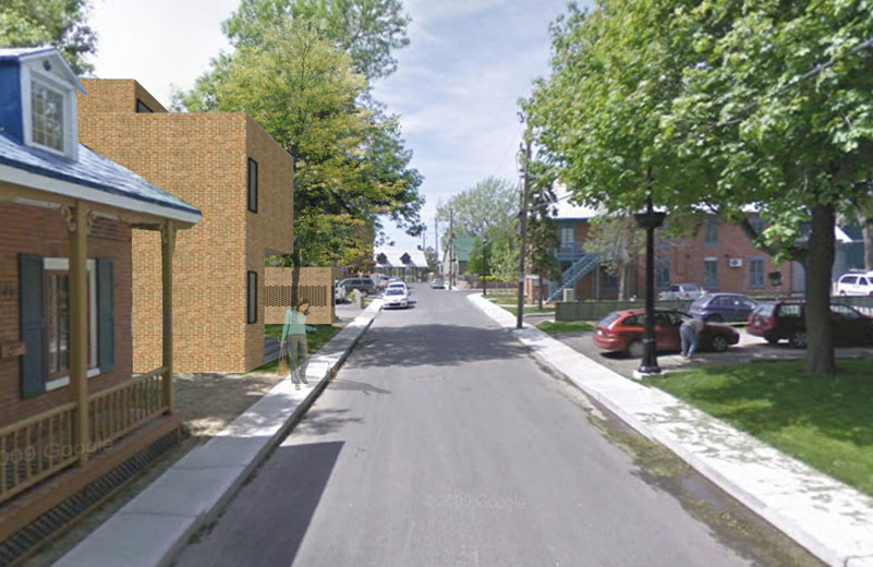 Les hauteurs des volumes sont variées car le projet s’insère dans la rythmique paysagère créée par les toitures existantes et le couvert végétal de l’arrondissement historique. Enfin, la carte de 1907 de La Prairie démontre la façon dont les bâtiments sont implantés densément en profondeur d’îlot. Suivant cette inspiration, le projet propose une stratégie pour densifier le site. La densité est une donnée qui était suggérée par la Ville.