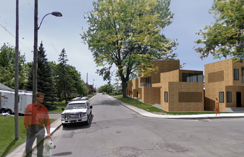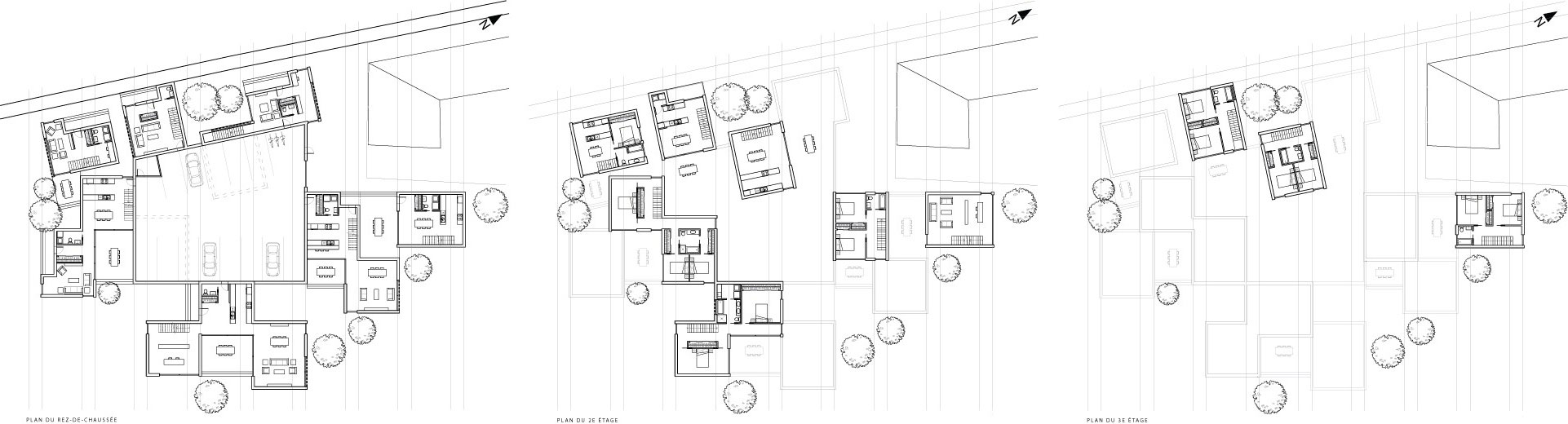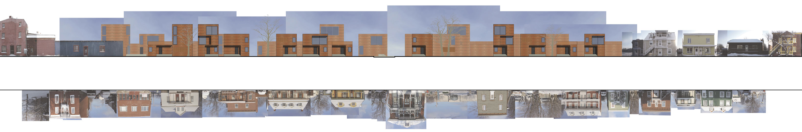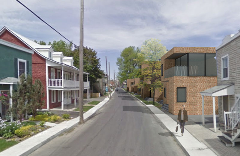 Le projet s’intègre à l’arrondissement historique de La Prairie en réinterprétant le morcellement de la forme bâtie existante à travers une hyper-fragmentation des nouveaux volumes. La délicatesse et la préciosité du détail dans l’arrondissement historique s’amalgament au projet qui traite de la petite échelle. Pour ce faire, l’implantation est régie par un système de trame qui correspond non pas à logements mais à des pièces qui sont disposées en enfilade.