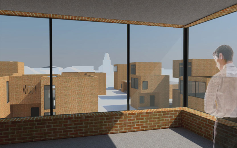 Cette distribution des espaces intérieurs dans différents volumes a conduit à un positionnement stratégique des ouvertures. Pour assurer une certaine intimité, les volumes de plusieurs résidences se replient sur eux-mêmes, autour d’une cour privée. À l’inverse, pour des pièces de séjour, les ouvertures permettent de dégager des vues sur le paysage. Cette relation avec l’environnement fait en sorte que l’implantation a été dessinée en fonction de percées visuelles sur certains bâtiments à grande valeur architecturale, tels que l’ancien hôtel de ville, l’ancien bureau de poste et l’église. Ces dégagements de perspectives depuis le cœur de l’îlot créent aussi des passages qui attirent le piéton vers l’intérieur de l’îlot.