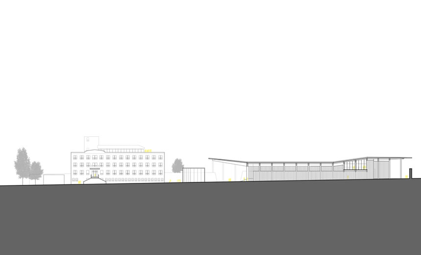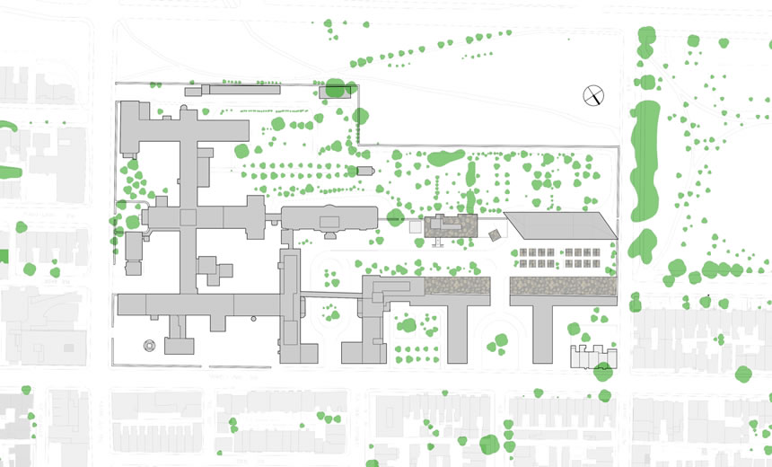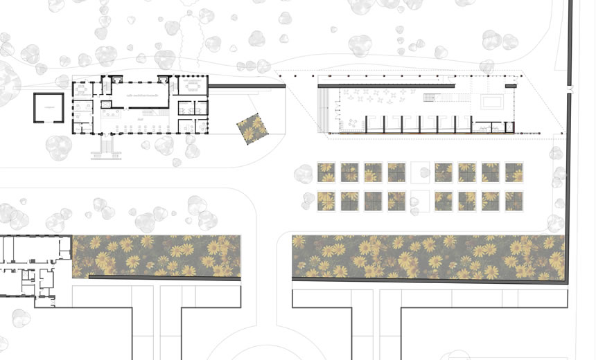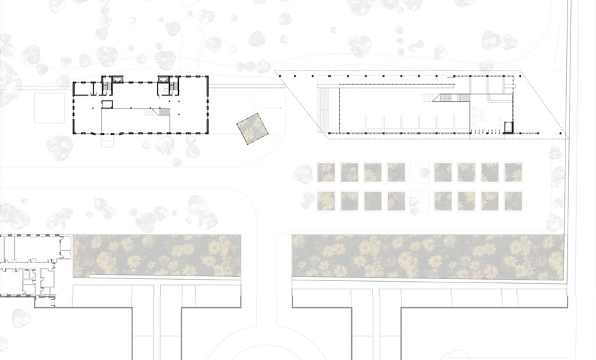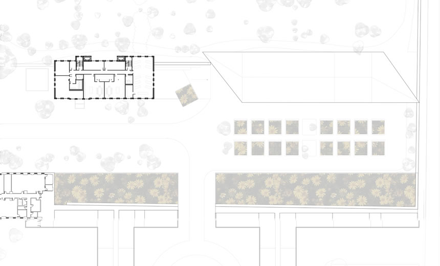 Mon projet est défini en association avec le pavillon de 1964, nommé Masson. Il s’implante donc dans une portion non construite du site de l’Hôtel‐Dieu, sur la jonction entre le Jardin des Sœurs et ce qui était anciennement appelé le Jardin des Pauvres (associé à la fonction d’Hôpital), soit en plein cœur de la fonction d’agriculture urbaine. À titre de diffuseur de l’agriculture urbaine, le projet comprendra plusieurs fonctions liées à l’information (ateliers d’agriculture, ateliers de cuisines, conférences, etc.), des espaces de culture éducatifs et une fonction de marché public quatre saisons. Le but de cette multiplicité d’usages liés à la culture est de créer un cycle complet d’agriculture urbaine, de l’ensemencement, à la production, à la vente, et finalement au compostage. Spatialement, les zones formatives seront situées dans le pavillon Masson, les serres seront situées au sol et sur le toit du pavillon Masson, alors que le marché occupera tout le nouveau bâtiment. Ce dernier comportera deux entrées principales, une au cœur du site et une sur la rue Duluth, afin de maximiser les accès piétons et véhiculaires.