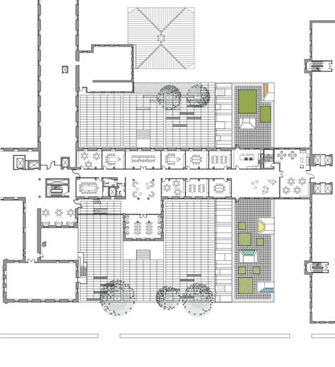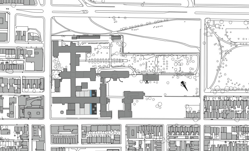 Et ce coloré quartier se situe dans un environnement singulier; l'Hôtel-Dieu de Montréal. Nichée sous le pavillon Marie Morin 5, la garderie, par sa matérialité et sa tectonique, semble glisser au-dessous de celui-ci. Tout comme le pavillon, la garderie rencontre les deux cours, la cour intérieure dite «secrète» et la cour bordant la rue Saint-Urbain. En fait cette garderie, tel un trait d'union, fait le lien entre le jardin et la ville, entre un lieu de quiétude et un lieu d'actions. Le bâtiment agit aussi comme un cadre, il recadre et réaffirme la cour Saint-Urbain, et par ses couleurs et ses volumes ludiques il encourage l'interaction sociale. Mais aussi, il rétablit le dialogue entre les pavillons et le gigantesque Bullion, celui-ci devenant en quelque sorte l'arrière-plan, le paysage du tableau.