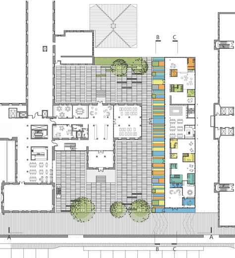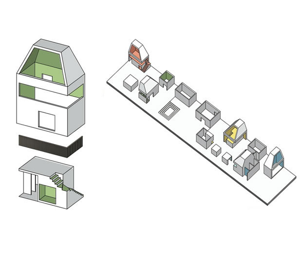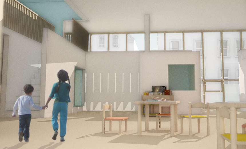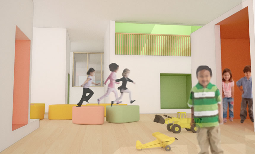 Un projet de garderie qui se propose comme une petite organisation urbaine à l'échelle de l'enfant. Cabanes et maisonnettes organisent et personnalisent les espaces dédiés à chacun des groupes (tranches d’âges). Et un grand axe de circulation bordant le mur rideau de bois et la cour extérieure connecte ces joyeux espaces. Cette garderie, telle une longue rue de quartier, invite à la rencontre et au partage à travers ses espaces communs.