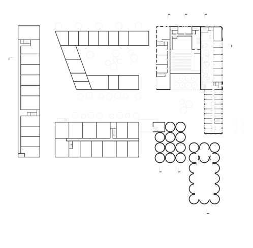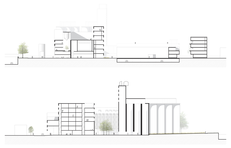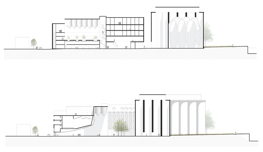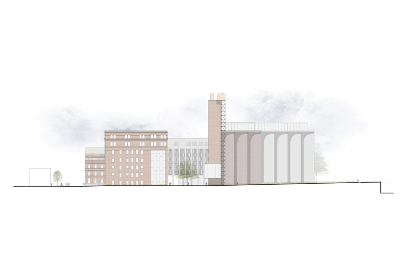 Faisant face à un bâtiment d'intérêt patrimonial, les interventions contemporaines se sont faites suivant les qualités architecturales de ce dernier de manière à conserver ses façades monumentales quasi- aveugles, sa silhouette distinctive et sa palette de matériaux. La transparence du rez-de-chaussée rend le bâtiment public, permet une fluidité des circulations et contraste avec les étages davantage opaques.