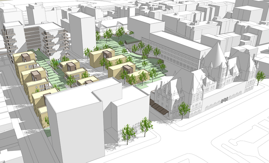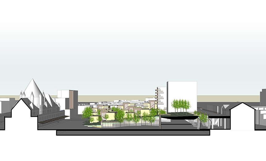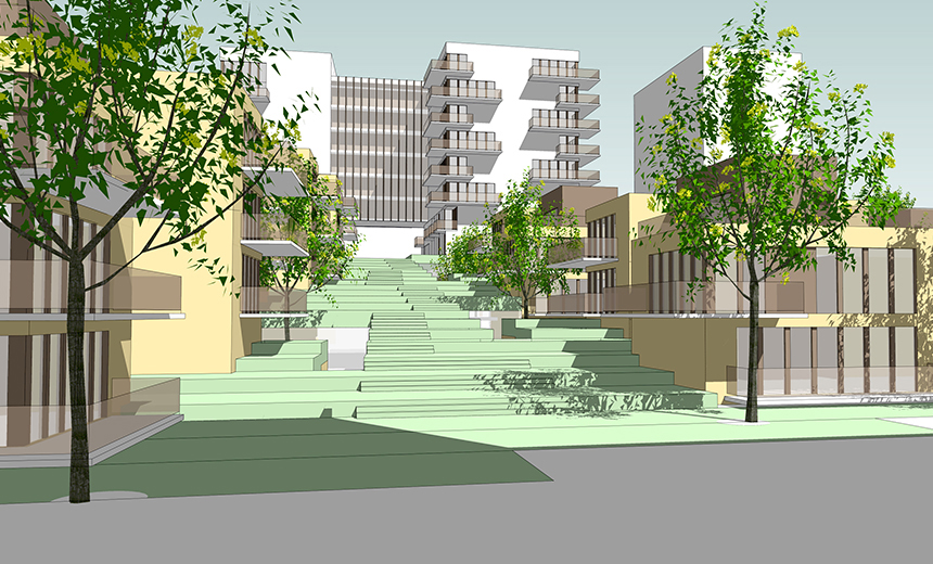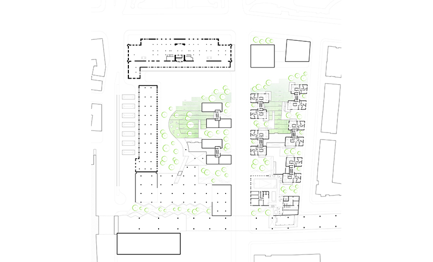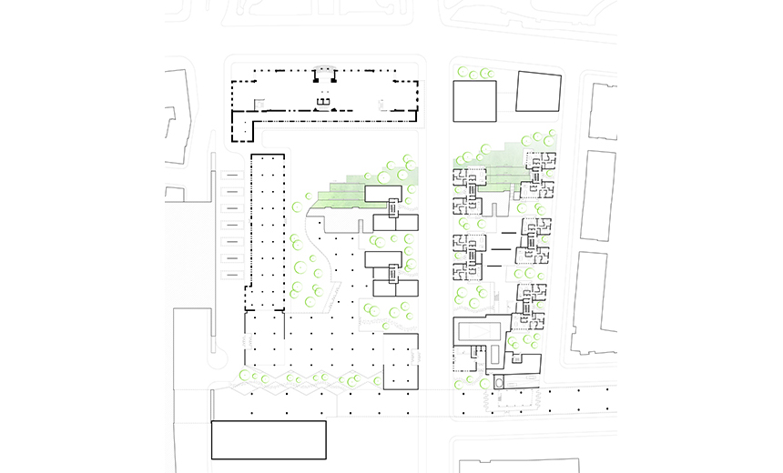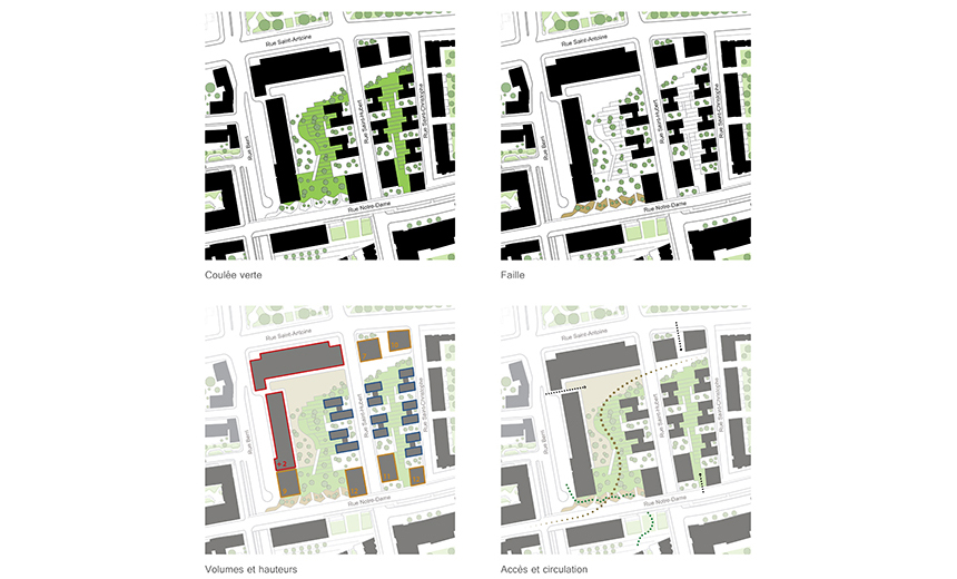 La complexité et la beauté du projet réside sa diversité spatiale et dans le rapport constant entre ancien et nouveau, dessus et dessous, haut et bas, grand et petit, ombre et lumière, public et privé. Les défis induits par le parti architectural de la pente ont nécessité de multiples stratégies pour ouvrir, connecter et illuminer les espaces sous la pente. Par bonheur, celles-ci se sont incarnées à travers une très grande variété dans l’expérience architecturale des usagers, qu’ils soient résidents, travailleurs, touristes ou simple passants. On peut y rencontrer cours, courettes, places, passerelles, terrasses, toits-terrasses, balcons d’angle, portes cochère monumentales, jardins, faille végétalisée, et encore plus d’éléments, qui agrémentent les parcours par des surprises renouvelées et des vues sur les bâtiments à valeur patrimoniale exceptionnelle. Sur l’ilot est, de nature plus résidentielle, les typologies d’habitation à basse densité auront une relation privilégiée avec la coulée verte et l’appropriation individuelle des balcons, toits-terrasses et des jardins donnera à cette pente le caractère d’une ruelle vernaculaire établie en étage à flanc de colline, habitée par des familles et leur enfants.
