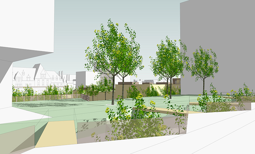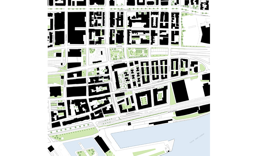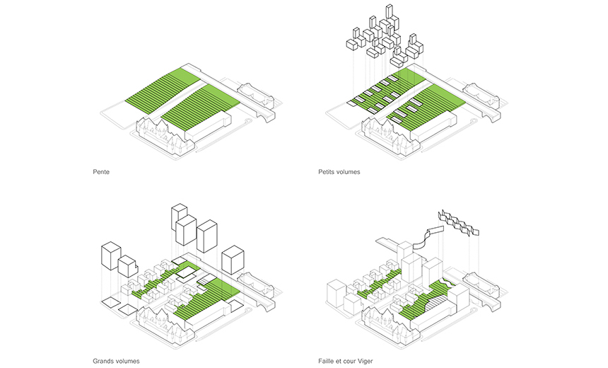 Quant à la forme et au concept architectural, ils ont pris racine dans une marque indélébile laissée par le temps et l’histoire ferroviaire du site, c’est à dire l’arasement de la topographie de la partie est de la colline du Vieux Montréal. Ainsi, l’idée fondatrice fut de recréer cette topographie par une pente offrant des jardins suspendus, qui se déploient en étages à partir du viaduc Notre-Dame jusqu’au niveau de la rue Saint-Antoine, derrière la gare-hôtel Viger. Il s’agit ici d’établir un dialogue soutenu avec le passé en évoquant une caractéristique oubliée du site, mais surtout de proposer une solution novatrice pour affronter les enjeux du présent. Par exemple, le projet intègre le viaduc Notre-Dame qui avait une relation ingrate avec son environnement en raison de sa position surélevée, il crée une coulée verte bénéfique en milieu urbain, il établit des nouveaux parcours et un paysage pittoresque mettant en valeur les vues sur la gare-hôtel Viger et ses toitures de style château, etc.