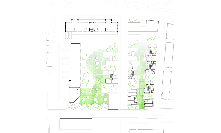 Plutôt que d’agir par une intervention directe sur les éléments architecturaux à valoriser, mon travail s’est orienté autour d’une revitalisation du site dans son ensemble, dans le but de redonner une énergie nouvelle au quartier, et de répondre à ses besoins naissants. C’est pourquoi le projet propose principalement un programme d’habitations, tout en offrant une certaine mixité incluant des espaces collectifs, des commerces, un hôtel, et des bureaux. Car la vitalité d’un quartier repose certes sur son dynamisme économique, mais aussi et surtout sur son dynamisme humain et social, à travers ses habitants.