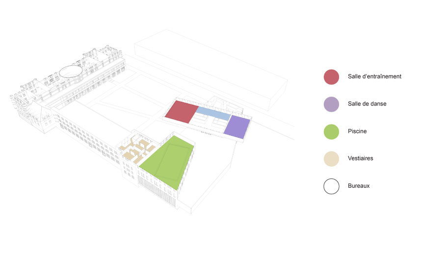 Le premier mouvement prend naissance dans un grand parvis qui mène de la rue Notre-Dame à l'entrée principale du complexe sportif. On y trouve également l’accès aux salles de danse et aux vestiaires de la piscine. Le deuxième mouvement se traduit dans la création d'un bâtiment faisant dos au nouveau quartier résidentiel à l’est et faisant front sur la rue St-Hubert. Le troisième mouvement apparaît dans le grand porte-à-faux qui surplombe la cour intérieure et vient faire appel au bâtiment de la gare Viger, le plus important sur le site. Le centre sportif est composé d’un grand gymnase, d’un centre d’escalade, d’un gymnase, d’un petit restaurant, de salles de danse et d’une piscine. Le projet se voulait un endroit qui attire les gens et qui ferait renaître l’essence de ce qu’était la gare autrefois, dans toute sa grandeur et son activité.