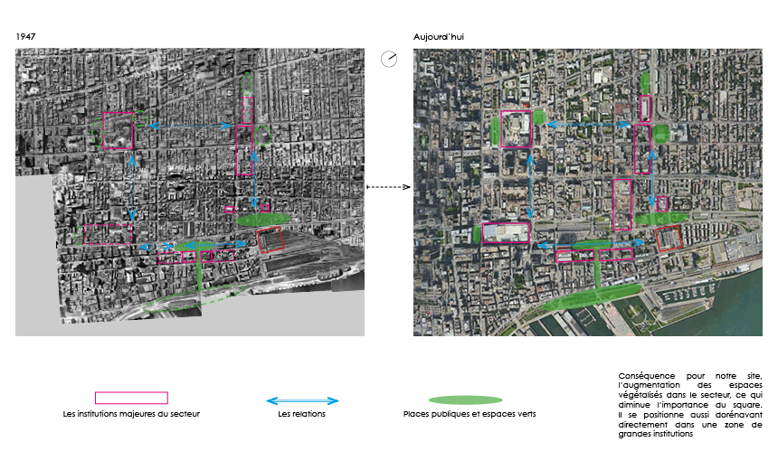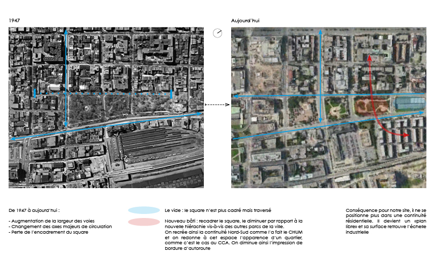 Une comparaison du secteur, basée sur des photos de 1947 et de 2015, a permis de mieux appréhender le problème auquel fait actuellement face le square Viger. D’abord, l’autoroute Ville-Marie, en plus de couper le secteur en deux, a transformé l’ancien square en un échangeur en pleine ville. De plus, le square n’est plus cadré et il perd sa fonction de catalyseur. Cet aspect est d’ailleurs renforcé par le fait qu’au fil des décennies, le nombre de parcs a grandement augmenté dans le secteur, ce qui a eu pour effet de le dévaluer encore plus. Ainsi, l’une de mes premières actions a été de considérer la construction de l’îlot le plus à l’est de l’actuel square. Ce premier geste a influencé le rapport des pleins et des vides sur le site des anciennes gares, de manière à générer un parcours urbain riche et diversifié tant pour les institutions que pour les résidents du secteur. Le square Viger reste ainsi le parc urbain qu’il était, alors qu’un parvis sur la rue Saint-Hubert, tout en ponctuant le parcours, vient s’adresser davantage au campus et au quartier.