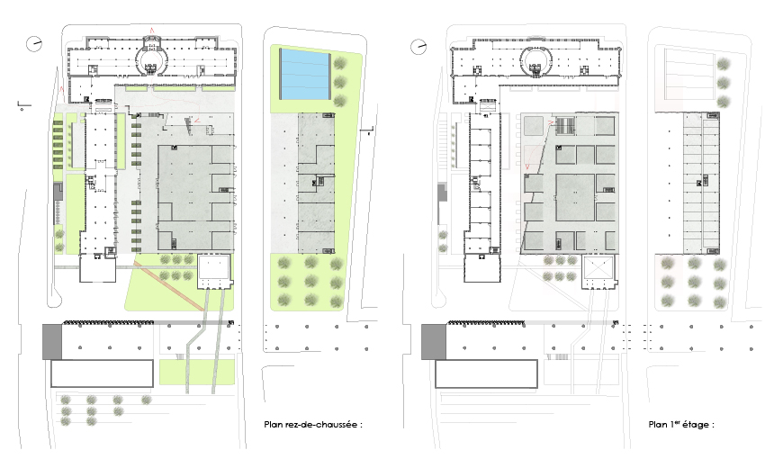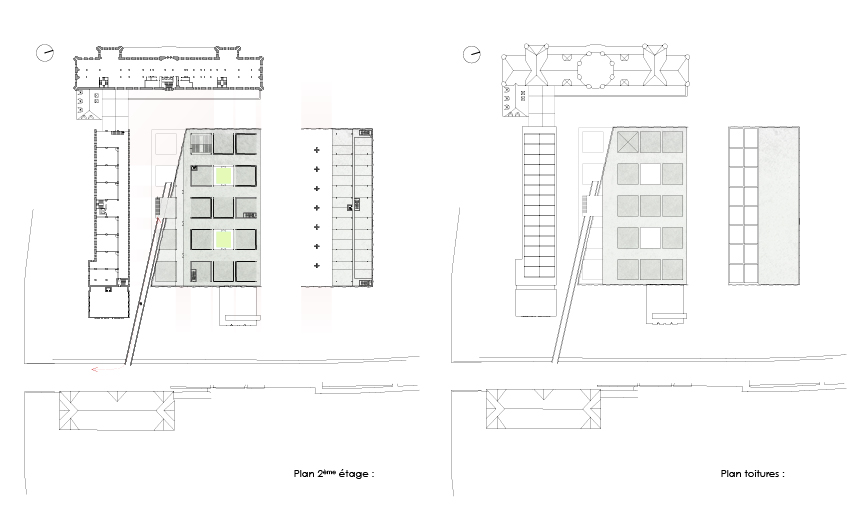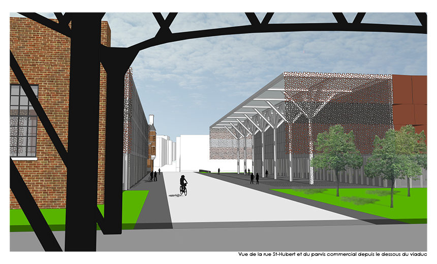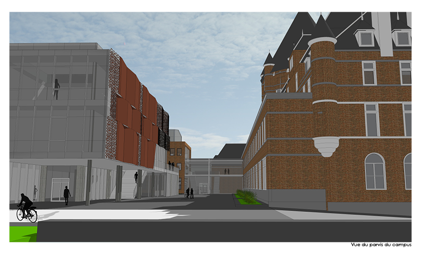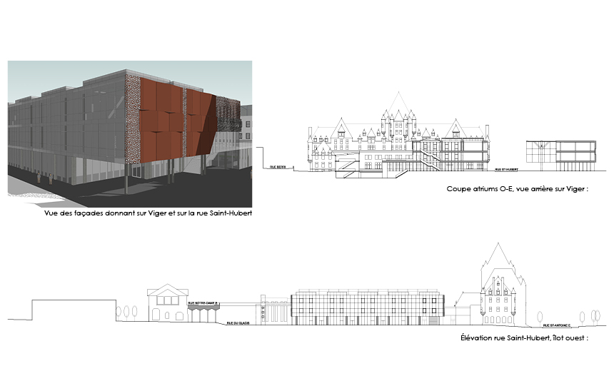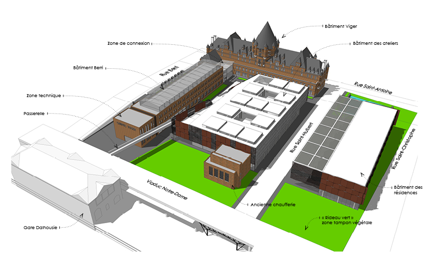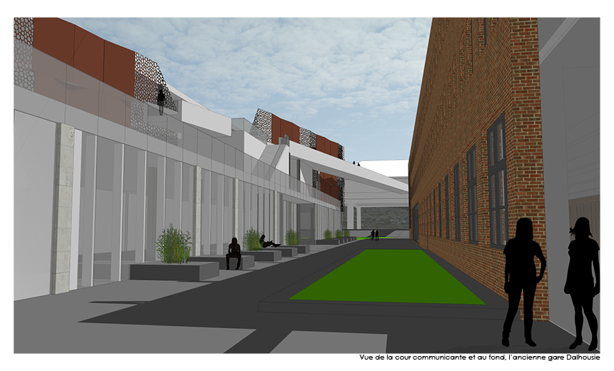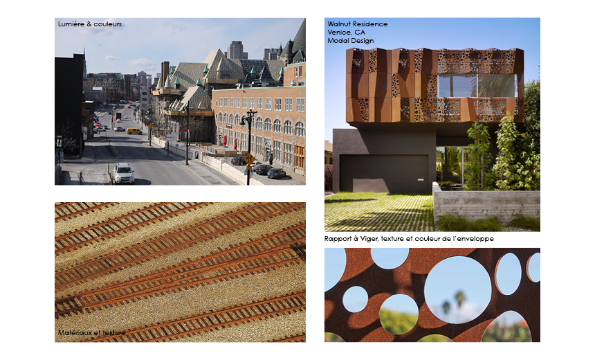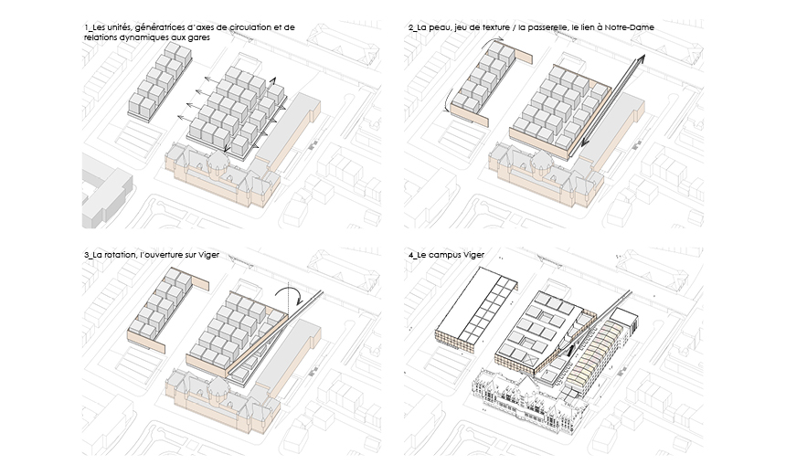 Une gare, c’est passer d’un monde urbain à un autre monde, passer dans un monde qui nous amène ailleurs. Ainsi, les gares deviennent le symbole d’une transition, et le cœur du site devient l’endroit où l’effervescence se crée. En partant de volumes (les ateliers de création) disposés pour générer des axes forts, je cadre aussi des vues sur l’existant de manière à accentuer les relations. De cette façon, des effets de profondeur se créent malgré la proximité de la cohabitation. Permettant l’accès au viaduc Notre-Dame, une passerelle en angle vient ouvrir l’espace et met la rotonde de l’ancienne gare Viger au cœur du parcours et des activités du campus. Les anciennes gares deviennent une partie intégrante du campus en accueillant l’administration et des classes, et l’ancienne chaufferie prend la fonction d’une salle d’exposition temporaire. Le nouveau bâtiment s’entoure d’une peau d’acier Corten, à la fois un rappel du passé métallique du site (le train) et de la teinte de la brique des gares. Son relief joue aussi avec les volumétries de l’ancienne gare Viger. Tantôt fermée, tantôt ouverte, cette peau suit les cadrages générés par les axes intérieurs du nouveau bâtiment.